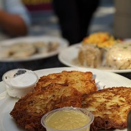 I've been wanting to stop in at Veselka for a while now and I finally made it on my most recent work trip! The staff was friendly and the service was quick to be seated, order and food came right out. The restaurant was busy but not packed and it was a great place to go by myself or to come back with friends. I tried the potato and cheese pierogis and the potato pancake. I grew up making pierogis and potato pancakes with my family and these did not disappoint! I ordered the pierogis fried and they were deliciously crispy on the outside and creamy on the inside. I will definitely be back in the future!